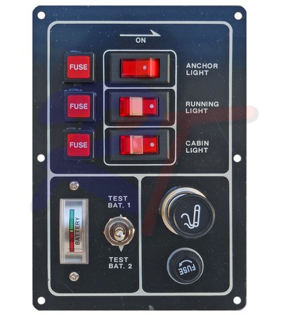Панель переключателей. Включает в себя три переключателя, детектор состояния аккумуляторных батарей (двух) и прикуриватель с гнездом.
