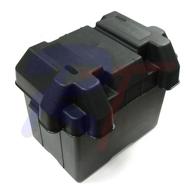 Пластмассовый, с крепежным ремнем. Размеры 360х280х240 мм.