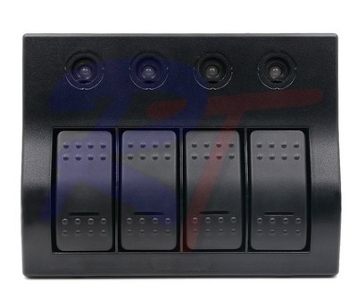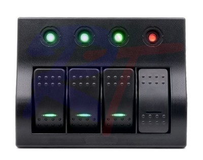 Оснащена тремя двухпозиционными клавишами и одной двухпозиционной нефиксируемой клавишей, со светодиодной подсветкой. Четыре автоматических предохранителя, 2х5А, 10А и 15А со светодиодными индикаторами. Материал - пластмасса. Размеры 100х130 мм.